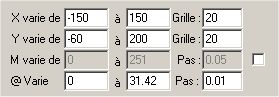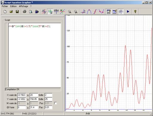Entrez à titre d'exemple l'équation r=@*(sin(@)+1.5)*(cos(5*@)+2); Il est plus que probable que du fait de bornes inadéquates, le résultat soit bien décevant . Réglez par exemple les bornes comme ci-dessous: